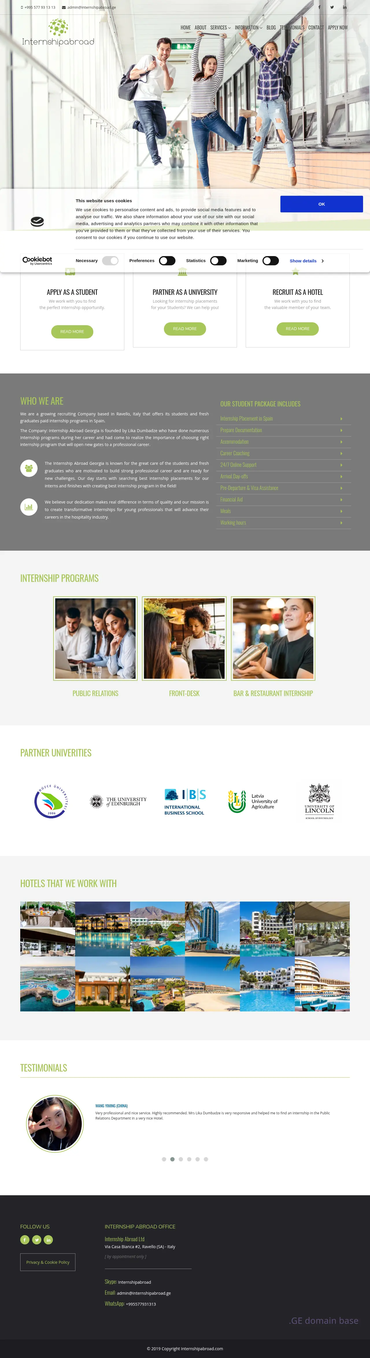 ეს ვებგვერდი, internshipabroad.ge, როგორც ჩანს, პლატფორმაა, რომელიც ეძღვნება ქართველი სტუდენტებისთვის საერთაშორისო სტაჟირებისა და საზღვარგარეთ სწავლის შესაძლებლობების ხელშეწყობას. 2017 წელს გაშვებული და რეგისტრირებული როგორც "შპს Internship Abroad", ის იყენებს Joomla CMS-ს, რაც გავრცელებული არჩევანია ქართული ბიზნესებისთვის, რომლებიც ეძებენ მოქნილ ვებ გადაწყვეტილებებს. მიუხედავად იმისა, რომ ამჟამინდელი მეტა აღწერა შაბლონზე მიუთითებს, H1 და H2 სათაურები ნათლად მიუთითებენ სტუდენტების სხვადასხვა სექტორში, როგორიცაა სტუმართმოყვარეობა და საზოგადოებასთან ურთიერთობა, გამოცდილებასთან დაკავშირებაზე და ასევე უნივერსიტეტებისა და სასტუმროების პარტნიორებად სამიზნე აუდიტორიაზე. ქართული ტელეფონის ნომრისა და `.ge` დომენის არსებობა მკაცრად მიუთითებს, რომ მისი ძირითადი აუდიტორია საქართველოშია და მიზნად ისახავს გლობალური პროფესიული განვითარების ხელმისაწვდომი გზების უზრუნველყოფას.