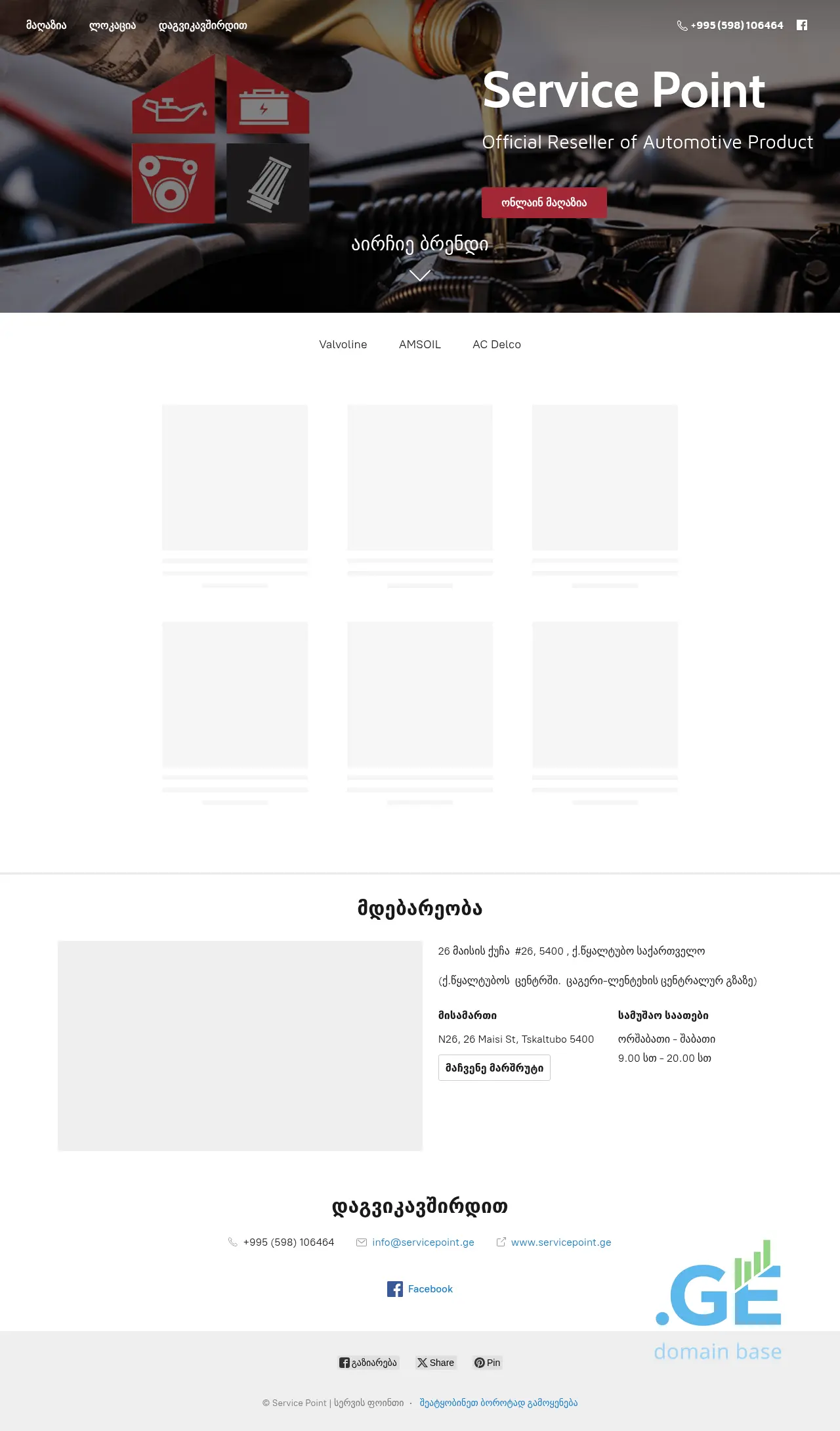 ServicePoint.ge არის ავტომობილების პროდუქციის გადამყიდველის ოფიციალური ონლაინ წარმომადგენლობა, რომელიც დაფუძნდა 2020 წლის აპრილში. ვებსაიტი ნათლად მიუთითებს მის მთავარ ფუნქციას, რომელიც ოფიციალური ავტომობილების პროდუქციის შეთავაზებაა. მომხმარებლებთან კომუნიკაციისთვის, Service Point უზრუნველყოფს პირდაპირი კონტაქტის შესაძლებლობას ტელეფონის საშუალებით და ბმულებს მის სოციალურ მედია პროფილებზე Twitter-სა და Facebook-ზე. მიუხედავად იმისა, რომ საიტი დაცულია HTTPS-ით და აგებულია ec-instant-site პლატფორმაზე, მას ამჟამად აკლია მომხმარებელთა შეფასებები და ანალიტიკური თვალთვალის სისტემა.