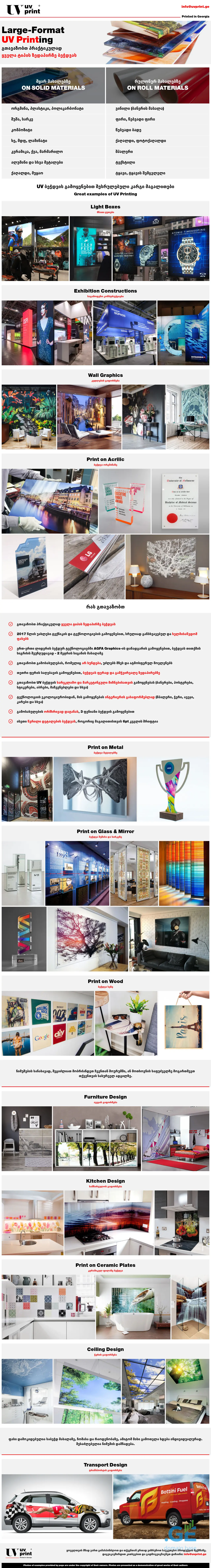 uvprint.ge არის ხანგრძლივი ისტორიის მქონე ვებგვერდი, რომელიც 2017 წელს დაარსდა და ორიენტირებულია დიდი ფორმატის UV ბეჭდვის სერვისების მიწოდებაზე. საიტი წარმოადგენს გამოყენების სრულ სპექტრს, მათ შორის ბეჭდვას მყარ და რულონურ მასალებზე, ლაითბოქსებზე, საგამოფენო კონსტრუქციებზე, კედლის გრაფიკაზე და სხვადასხვა ზედაპირებზე, როგორიცაა აკრილი, ლითონი, მინა, სარკე და ხე. კონკრეტული საკონტაქტო ინფორმაცია და მომხმარებელთა შეფასებები საჯაროდ არ არის ნაჩვენები, თუმცა ვებგვერდი დაცულია HTTPS-ით, რაც მიუთითებს მომხმარებლის უსაფრთხოებაზე ზრუნვაზე. მისი აქცენტი კეთდება UV ბეჭდვის ხარისხისა და მრავალფეროვნების ვიზუალური მაგალითებით დემონსტრირებაზე.