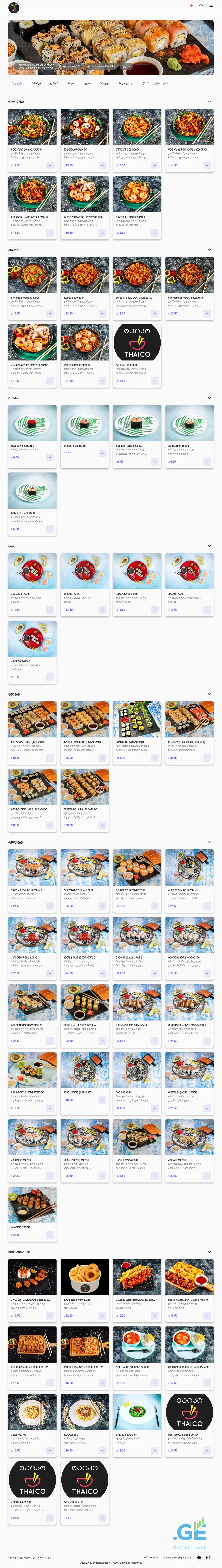 Thaico.ge appears to be the online presence for "Tatia Dvalishvili," a Georgian individual, likely operating a food service business specializing in Asian cuisine. The site's headings clearly indicate a focus on noodle dishes, rice, gunkan, maki rolls, and various set meals, suggesting it caters to the growing demand for such food options in Georgia. Launched in mid-2023 and featuring social media links to Facebook and Instagram, Thaico.ge is actively engaging with customers in a manner typical of Georgian e-commerce businesses. The use of Yandex.Metrika as an analytics tracker is also a common practice within the Georgian digital landscape.